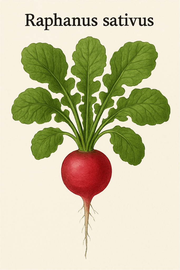 Raphanus sativus” (राफानस सैटिवस) एक वैज्ञानिक नाम है — यह मूली (Radish) का बोटैनिकल / वनस्पति विज्ञान नाम है।